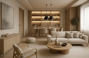 光と影、素材と質感が整えるホテルライクな和モダン。融合する暮らしと間取りから、窓・動線・家具レイアウトまで一体で考える程よさと上質を纏うインテリア設計を。