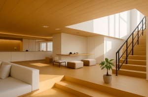 光と陰影が紡ぐ家族の気配をつなぐ住まい。 上質なナチュラル系の和モダンで叶えるLDKと階段、吹抜け空間と隠しDENで居心地と一体感のある暮らしを設計提案。