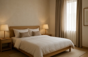 寝室デザイン×和モダン・眠りの質を高める色・照明・素材、ホテルライクな安らぎを叶える寝室の間取りと空間のつくり方、心が深く休まる寝室計画のポイント提案。