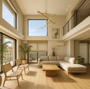 吹き抜けという空間の余白が育む、ナチュラルでホテルライクな住まいの豊かさ・子育て世代の暮らしに寄り添い、未来のライフスタイルの変化にもしなやかに応えるリビング空間の設計。